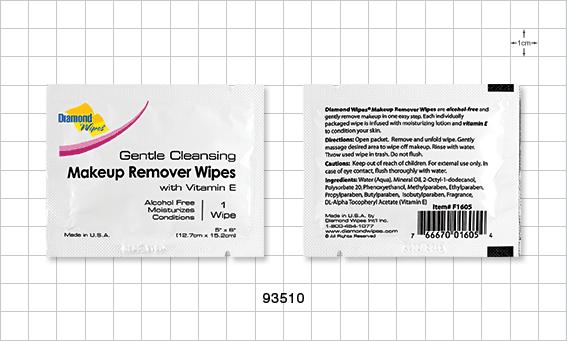 Gently remove makeup in one easy step with these alcohol-free Makeup Remover Wipes by Diamond Wipes®. Each individually packaged wipe is infused with moisturizing lotion and vitamin E to condition skin. Directions: Open packet. Remove and unfold wipe. Gently massage desired area to wipe off makeup. Throw used wipe in trash. Do not flush. Caution: Keep out of reach of children. For external use only. In case of eye contact, flush thoroughly with water.