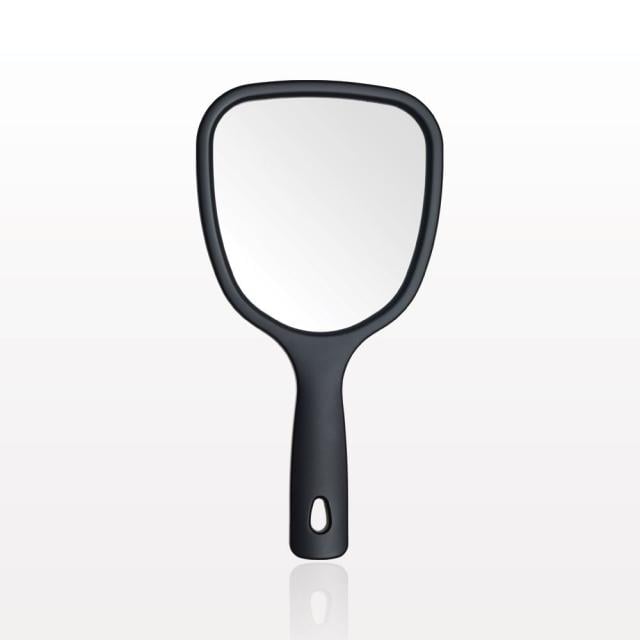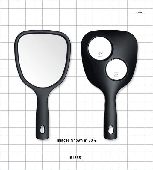 This matte black, hand held dual sided mirror is perfect for showing customers their before and after looks during a makeover. One side offers a 1x magnification and the other offers both a 3x and 5x magnification for close-up views.