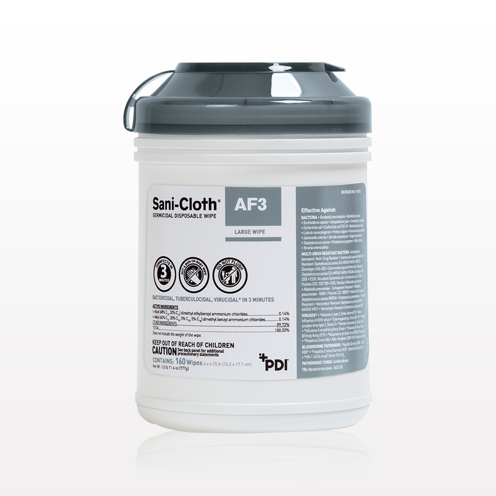 PDI Sani-Cloth® AF3 Germicidal Disposable Wipes provide fast, effective surface disinfection with a 3-minute contact time in a convenient, ready-to-use format. The alcohol-free, bleach-free, and fragrance-free formula is safe for a wide range of hard, non-porous surfaces, making these wipes ideal for medical, dental, and professional environments.