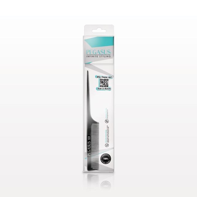 This fine-tooth rat tail comb is a must-have for any professional styling kit. Use the thin rubber tail on one end to section off and partition hair, then comb it out using the other side. It can also be used for teasing hair to create volume with ease. Made from 100% hard rubber, this tool is scratch and tangle-free, heat-resistant, anti-static, and extremely durable. Crafted with Flexinite Technology, this comb is sensitive to changing temperatures so the perfectly rounded teeth mimic hair and move flexibly, expanding when treated with heat during styling. Includes measuring marks for added convenience.